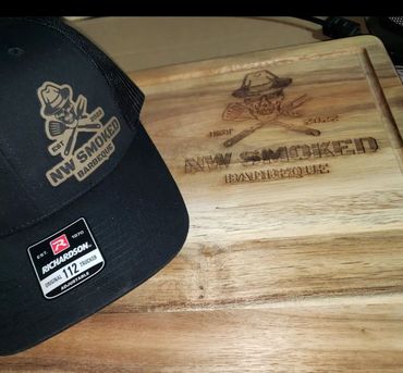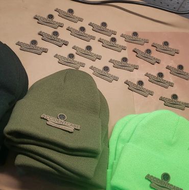 We specialize in Custom Leatherette Patches on Hats. Engrave pretty much anything too.